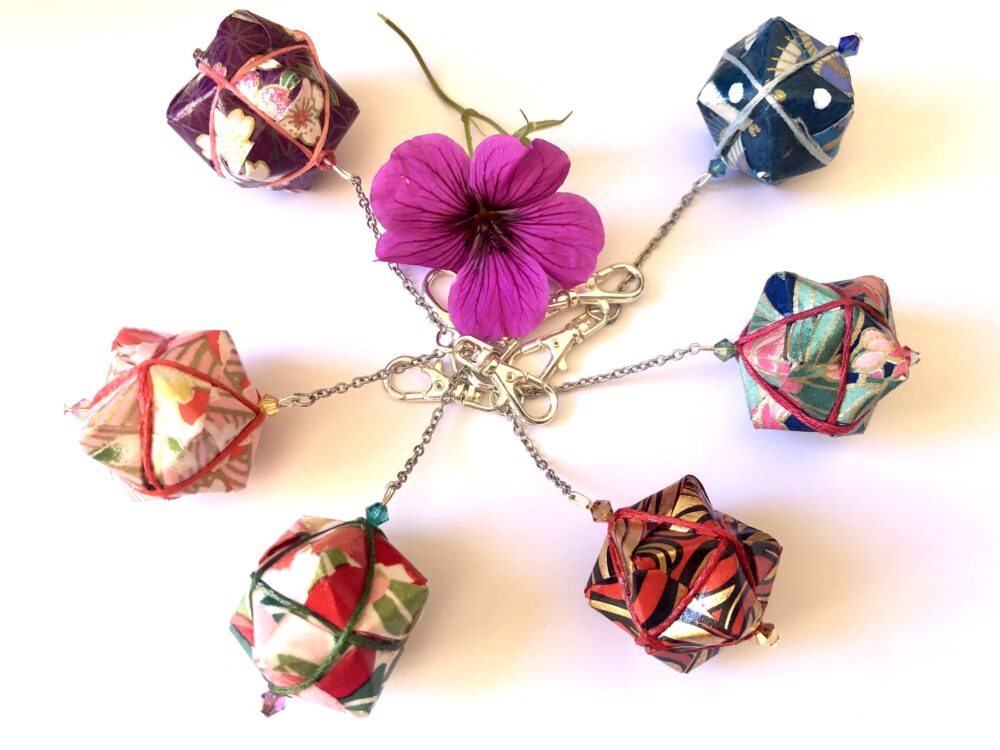 J’ai détourné ces boules kusudama en bijoux ou porte clé. En objets décoratifs à poser ou à suspendre. Vous pouvez également les associer avec mes fleurs de papier légères et colorées.